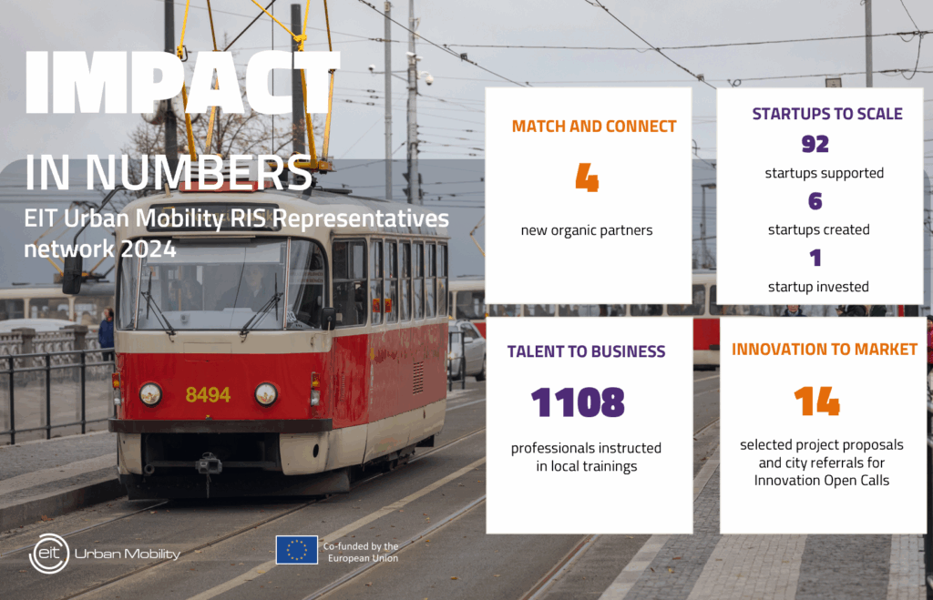 During 2024, the EIT Urban Mobility RIS Representatives network incorporated 4 new organic partners, 92 startups were supported, while 6 where created and 1 was invested. Also, thanks to our regional partners, 14 project proposals were selected for the Innovation Open Calls, and 1108 professionals were instructed in local trainings.